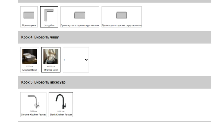 The user can select sinks and accessories from the catalog, specify quantities, and immediately see their cost reflected in the total price.